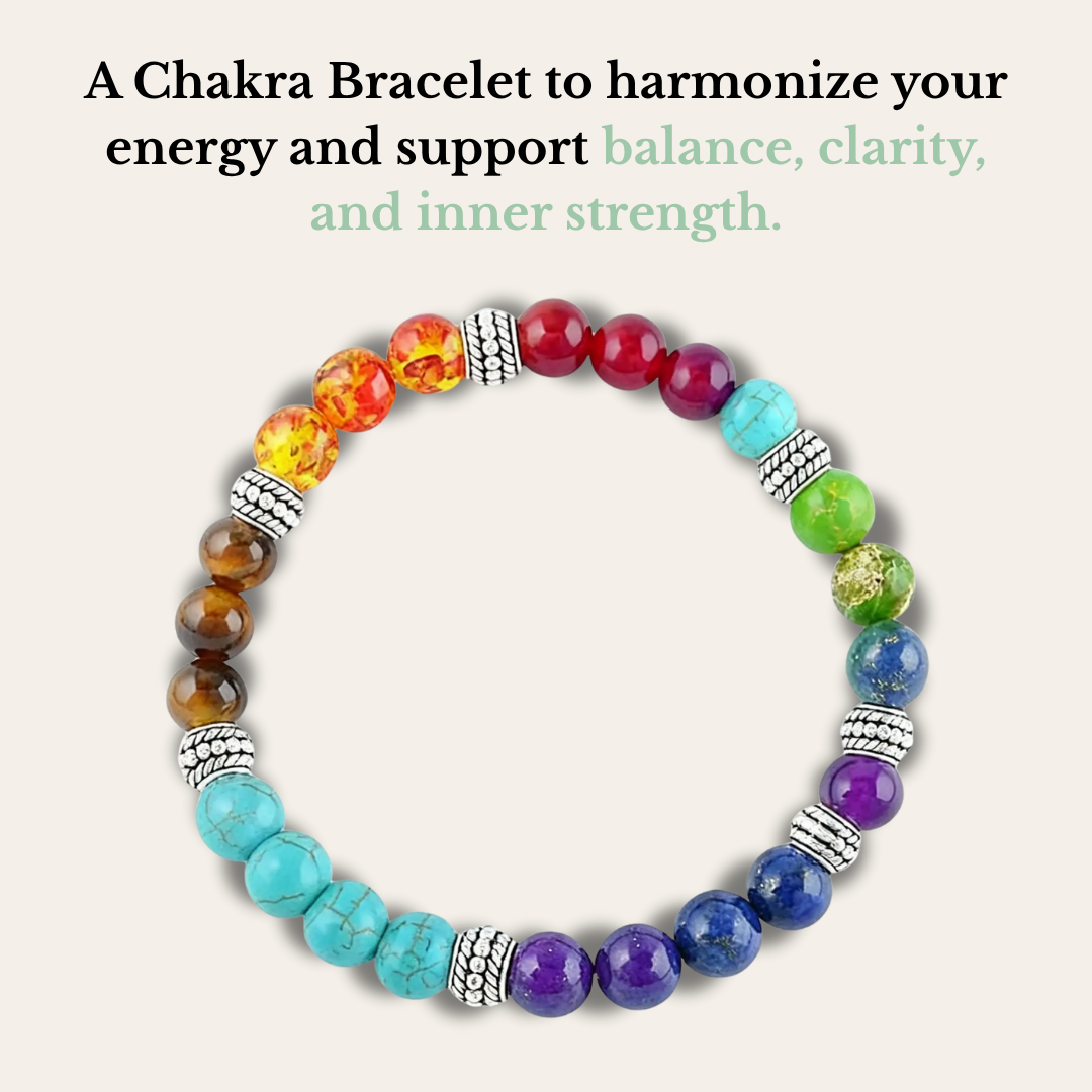Crafted with 8 mm round beads, each representing one of the seven chakras, and accented with subtle silver-toned spacers, it combines elegant design with energetic intention. The durable elastic cord ensures a comfortable fit for both men and women.